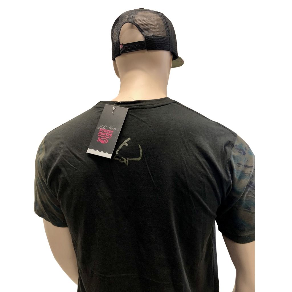 Triko značky LK baits z nové kolekce Street hunter. 100% bavlněné triko černé barvy s krátkým rukávem a kulatým výstřihem. Je zajímavé svým originálním designem s maskáčovými rukávy. Na zádech je motiv kapří hlavy a slogan firmy LK Baits: „spojení s velkými kapry“ a logo LK Baits na prsou. Triko je vhodné na každodenní nošení. Zaručuje pohodlí v každé situaci.