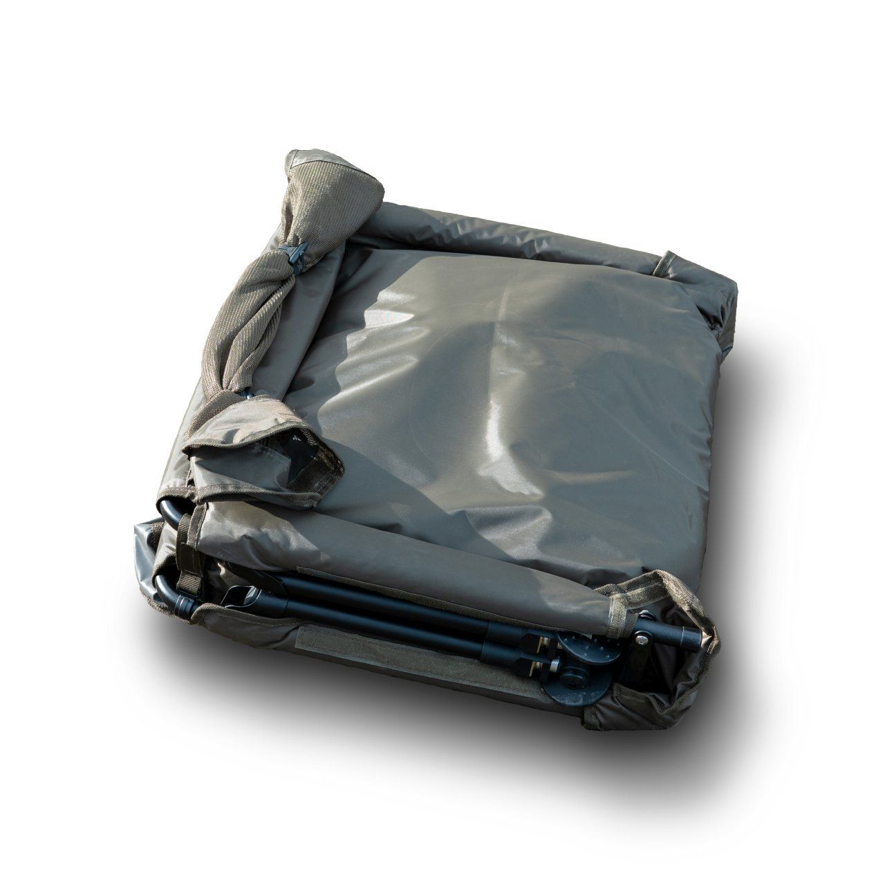 Carp Cradle Mat DLX DLX je velká kaprová kolébka s rozměry 101 x 62 x 36 cm. Je vyrobena ze Super Soft 210D vodotěsného PVC materiálu s ocelovým rámem. Má nastavitelné nohy s velkými polštáři, aby se vypořádala s nerovným či blátivým povrchem. Velmi bytelný síťový přehoz a drenážní síťka ve spodních rozích umožňují dokonalou péči o zdolanou rybu. Kolébka je skladná a snadno přenosná, váží pouhých 3,38 kg.