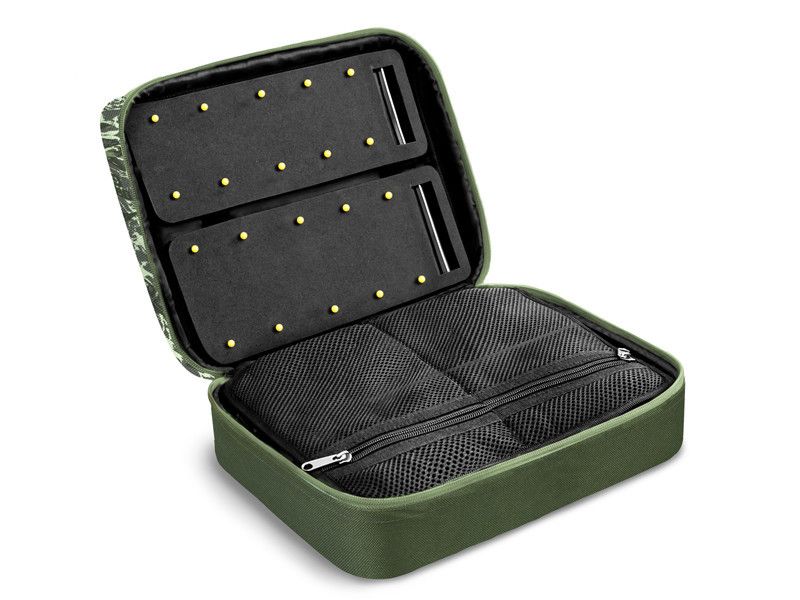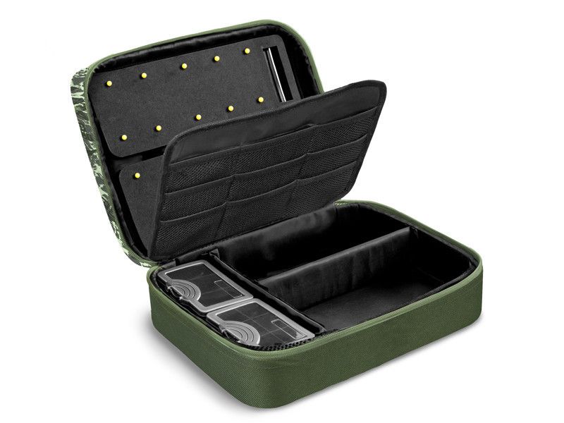 Hlavní přihrádka poskytuje velkorysý prostor pro uložení různé bižuterie, návazcových šňůr a nářadí potřebného k sestavení vašich montáží. Navíc se v ní nacházejí 4 praktické krabičky, ve kterých bude vaše bižuterie vždy v pořádku. Středový panel je opatřen malými síťovými kapsami na jedné straně a velkou síťovou kapsou na straně druhé. Díky tomuto provedení vždy vidíte, co se nachází uvnitř a bez problémů tak najdete vždy tu požadovanou část výbavy. RigStation obsahuje také dvě pěnové plochy sloužící k dokonalému uspořádání a uchycení vašich návazců. Devizou této tašky je také úchop, situovaný v horní části, díky čemuž tašku při transportu nepřevracíte a všechny komponenty v ní jsou tak stále na svém místě. Navíc je vybavena kvalitními zipy s efektními plastovými taháčky.